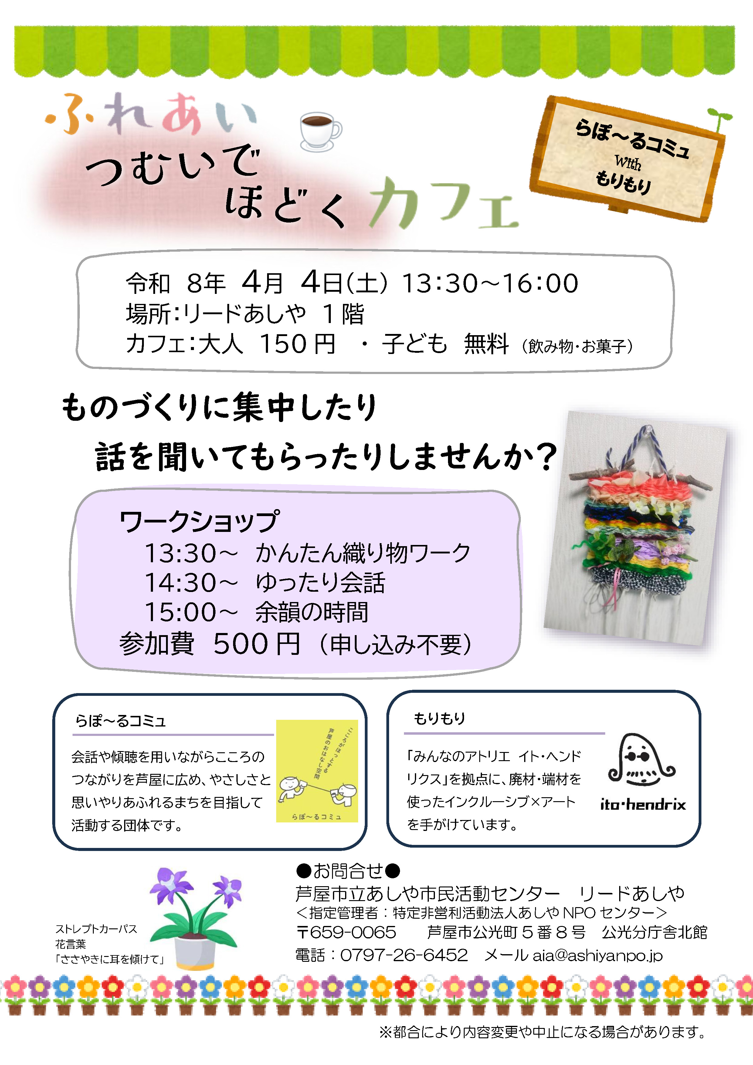 ものづくりに集中したり話を聞いてもらったりしませんか? 今回はらぽ〜るコミュとみんなのアトリエ イト・ヘンドリクスのもりもりとのコラボ企画です。